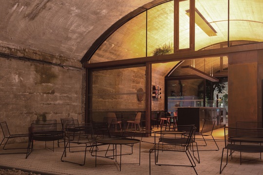 In zwei hintereinanderliegenden Viaduktbögen der Innsbrucker „Bogenmeile“ wurde im Zuge der Errichtung der neuen S-Bahn-Haltestelle eine zweiseitig geöffnete Café-Bar realisiert. Der straßenseitige Bogen beherbergt das eigentliche Lokal, der südseitige wurde in eine gedeckte Loggia transformiert. Das Innere wird geprägt durch den Kontrast zwischen der vorhandenen Substanz und maßgefertigten, matt schwarz lasierten Möbeleinbauten aus Verpackungssperrholz.