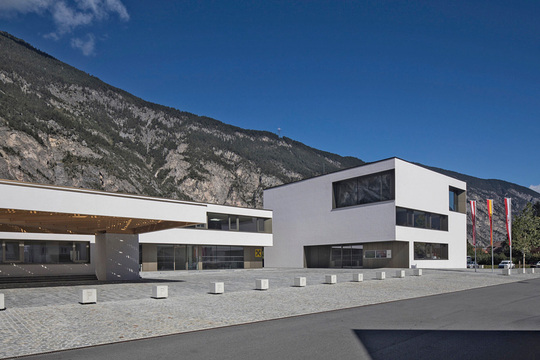 In einem sehr heterogenen Kontext am Rand des alten Ortskerns wurde durch den Abbruch des alten Gemeindehauses der Weg frei für eine Neugestaltung des Areals, mit der die Gemeinde auch einen bis dato fehlenden Dorfplatz erhielt. Zwei reduzierte Baukörper – ein dreigeschoßiges Gemeindehaus und ein zweigeschoßiger Riegel mit Bank, Arztpraxis und Vereinsräumen – fassen zusammen mit bestehenden Gebäuden einen klar definierten, in maßstabsgerechte Teilbereiche gegliederten Platz.