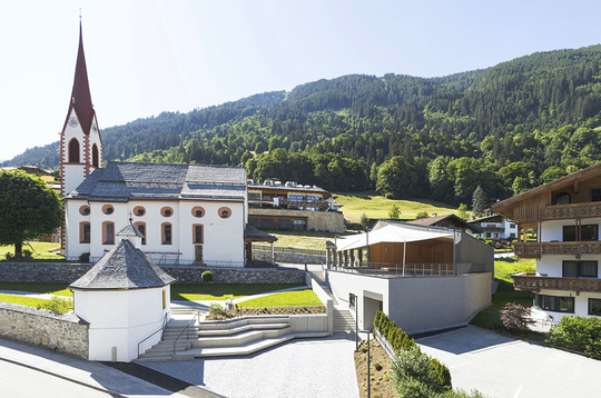 Mit dem Neubau eines Musikpavillons samt zum Teil unterirdischem Probelokal erhielt Finkenberg einen neuen dörflichen Mittelpunkt. Ein steinerner Sockel und ein hölzerner Aufbau mit gefalteten Dächern greifen regionale Bautraditionen auf und führen sie in zeitgemäßer Formensprache weiter. Wesentlicher Bestandteil ist eine neue Wegführung mit offener Treppenanlage, die das Dorf mit der Pfarrkirche verbindet.