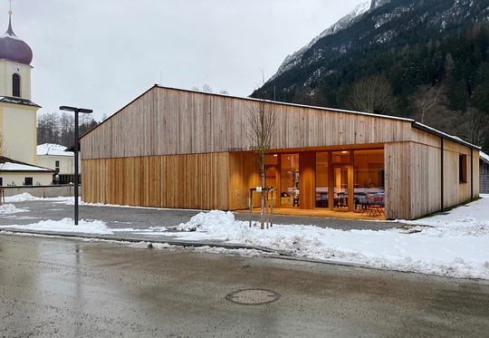 Mit dem Dorfhaus erhielt die kleine Gemeinde Forchach eine neue Mitte, die gezielt auf die Bedürfnisse der Bevölkerung abgestimmt ist. Der klare, eingeschossige Satteldachbau mit Lärchenholzfassade umfasst einen multifunktionalen Dorfsaal und eine als „Dorfstube“ gestaltete Gastronomie. Der neu gestaltete, gepflasterte Dorfplatz zieht sich über die Verkehrsflächen hinweg und verbindet Kirche, Volksschule, Gemeindeamt und Dorfhaus zu einem stimmigen Ensemble.