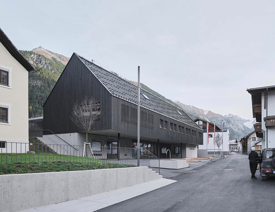 Entlang der zentralen Dorfstraße, die nach wie vor von ortstypischen bäuerlichen Gebäuden geprägt ist, entstand im Zug der Ortsbelebung ein neues Gemeindezentrum mit großzügigem Vorplatz. Im zurückgesetzten Massivsockel liegen Foyer und Veranstaltungssaal, darüber kragt ein Holzsatteldachhaus für das Gemeindeamt aus, das in zeitgemäßer Architektursprache an lokale Bautraditionen anknüpft.