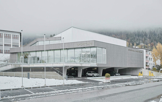 Als Ersatz für den alten Turnsaal entstand nordöstlich der gemeinsamen Mittelschule von Vomp und Stans ein quer zum Bestand gesetztes Volumen mit Dreifach-Halle, Tribüne und Gastronomie. Ein nach Süden offenes Parkdeck auf Straßenniveau bildet die Basis, darüber öffnet sich die Halle über eine transluzente Fassade nach außen. Die Setzung reagiert auf Topographie und Umfeld, neue Freiflächen und Wege binden die Anlage in das Schulareal ein.